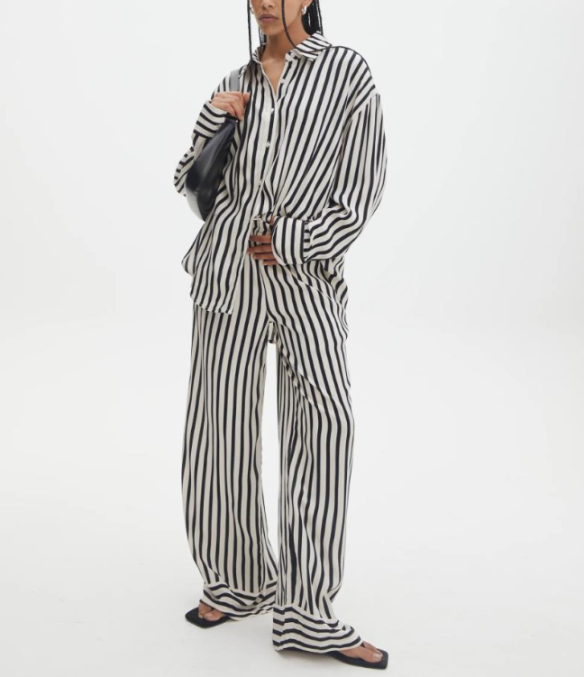 Dieses gestreifte Pyjama-Set für Damen bringt festliche Stimmung in Ihre Loungewear-Kollektion. Es besteht aus einem kurzen Oberteil mit Knopfleiste und Schleifendetail sowie einer Hose mit weitem Bein und verbindet saisonalen Charme mit entspannter Tragbarkeit. Ideal für gemütliche Abende, festliche Morgenstunden oder entspanntes Faulenzen im Urlaub.