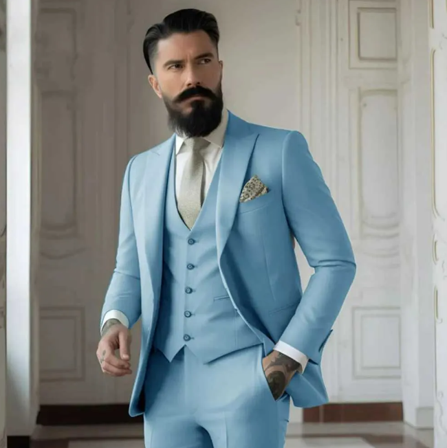 Dieser schlichte, aber raffinierte dreiteilige Anzug bietet einen klaren und zeitlosen Look für jeden besonderen Moment. Er ist ideal für Hochzeiten und formelle Anlässe und bietet eine scharfe Silhouette, die zu jeder Jahreszeit stilvoll bleibt.