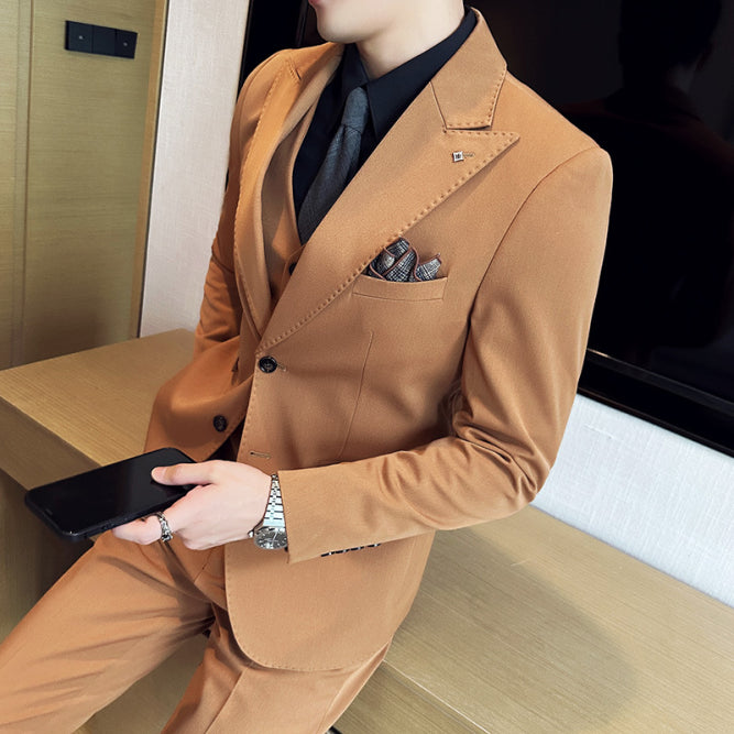 Ein raffinierter dreiteiliger Anzug, der sich durch sein spitzes Revers und seine strukturierte Schnittführung auszeichnet. Er wurde für diejenigen entworfen, die Wert auf Präsenz und Präzision legen, und bietet einen selbstbewussten Look für Hochzeiten, formelle Anlässe und besondere Feierlichkeiten.